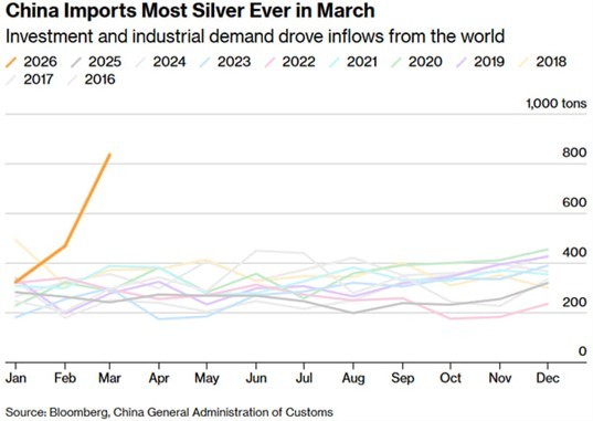 Rekordimporte bei Silber – China hebt sich deutlich von den Vorjahren ab: Der Chart zeigt die monatlichen Silberimporte Chinas im Vergleich der letzten Jahre. Während sich die Werte von 2016-2025 innerhalb einer relativ stabilen Bandbreite bewegen, sticht das Jahr 2026 deutlich hervor: Bereits in den ersten Monaten liegen die Importmengen über dem Durchschnitt, im März kommt es zu einem außergewöhnlich starken Anstieg. Dieser markante Ausbruch nach oben verdeutlicht, dass China aktuell deutlich mehr physisches Silber importiert als in den Jahren zuvor – ein klares Signal für eine stark gestiegene Nachfrage aus Industrie und Investment.