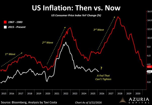 Die Grafik vergleicht die Inflationsentwicklung in den USA heute (weiß, seit 2015) mit der historischen Hochinflationsphase von 1967-1983 (rot). Damals verlief die Inflation in mehreren Wellen: Nach einem ersten Rückgang folgten weitere, teils stärkere Anstiege. Die aktuelle Entwicklung weist Parallelen auf und deutet darauf hin, dass die Inflationsphase möglicherweise noch nicht abgeschlossen ist. Datenquelle: Bloomberg; Grafik & Analyse: Tavi Costa (Azuria Capital), Stand: 22.03.2026