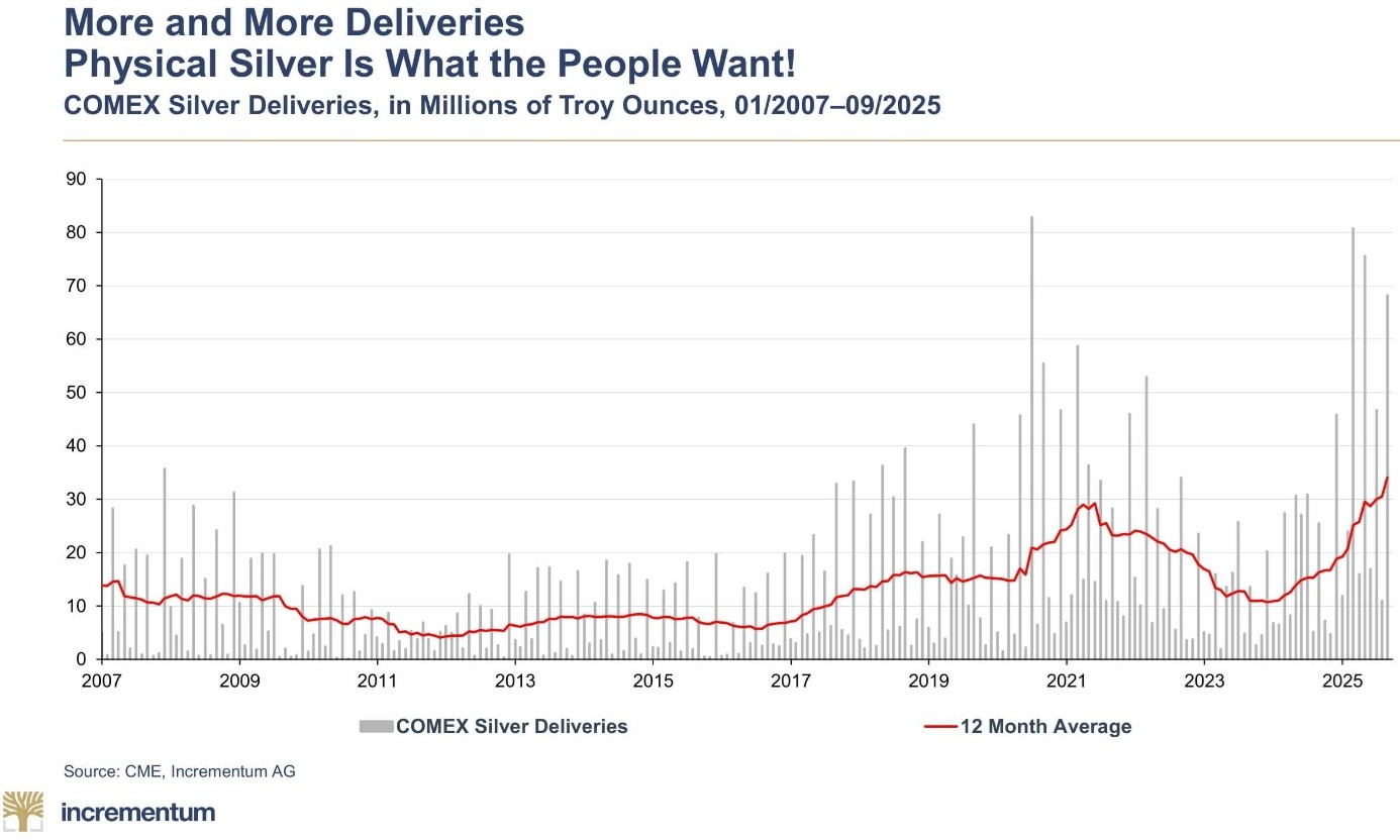 Der physische Silbermarkt sendet zurzeit sehr klare Signale. Im September wurden an der COMEX fast 70 Millionen Unzen Silber zur tatsächlichen Lieferung abgerufen – einer der höchsten Monatswerte aller Zeiten. Auch der 12-Monats-Durchschnitt steigt weiter an.