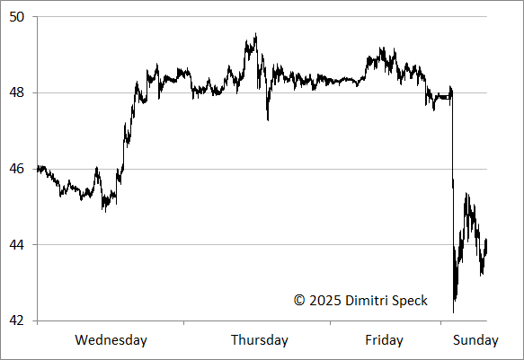 Kommen wir zu dem Verlauf des Kurses am Silberhoch gegen Ende des Jahres 2025. Der Chart zeigt dazu den Intraday-Verlauf des Spot-Silberkurses von Dienstag, den 23.12, über den feiertagsbedingt verkürzten Mittwoch am 24.12. und den nächsten Handelstag am Freitag, den 26.12. bis Sonntag, den 28.12.25, als sich das Hoch ereignete. Den Kursen innerhalb des Tages liegt die New Yorker-Zeit zugrunde. Daher gibt es bereits am Sonntagnachmittag Kurse, wenn in Australien montagfrüh der Handel beginnt, an der US-Ostküste aber noch Sonntag ist.